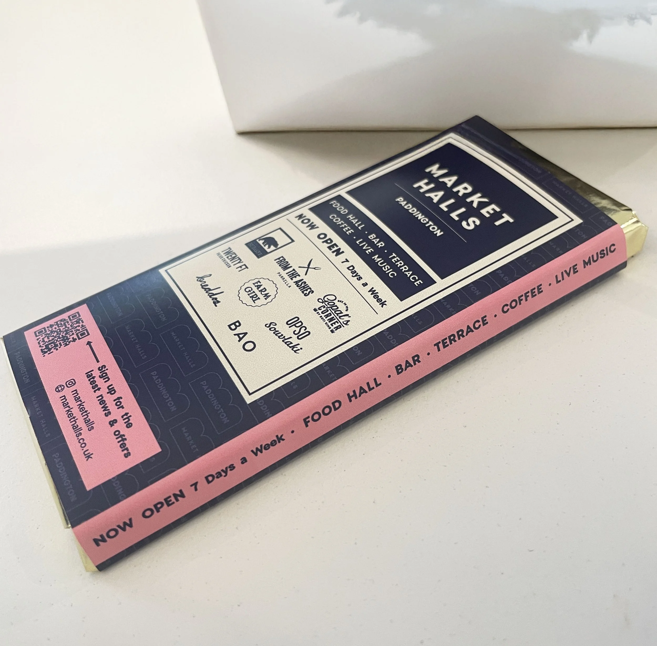 Instead of traditional flyering to build launch awareness, we designed chocolate bar packaging that contained all key information and distributed them during the first days of launch. Inside the bars, we concealed three golden tickets to create a surprise-and-delight moment; each ticket awarded the recipient 10 free meals and 10 free drinks.