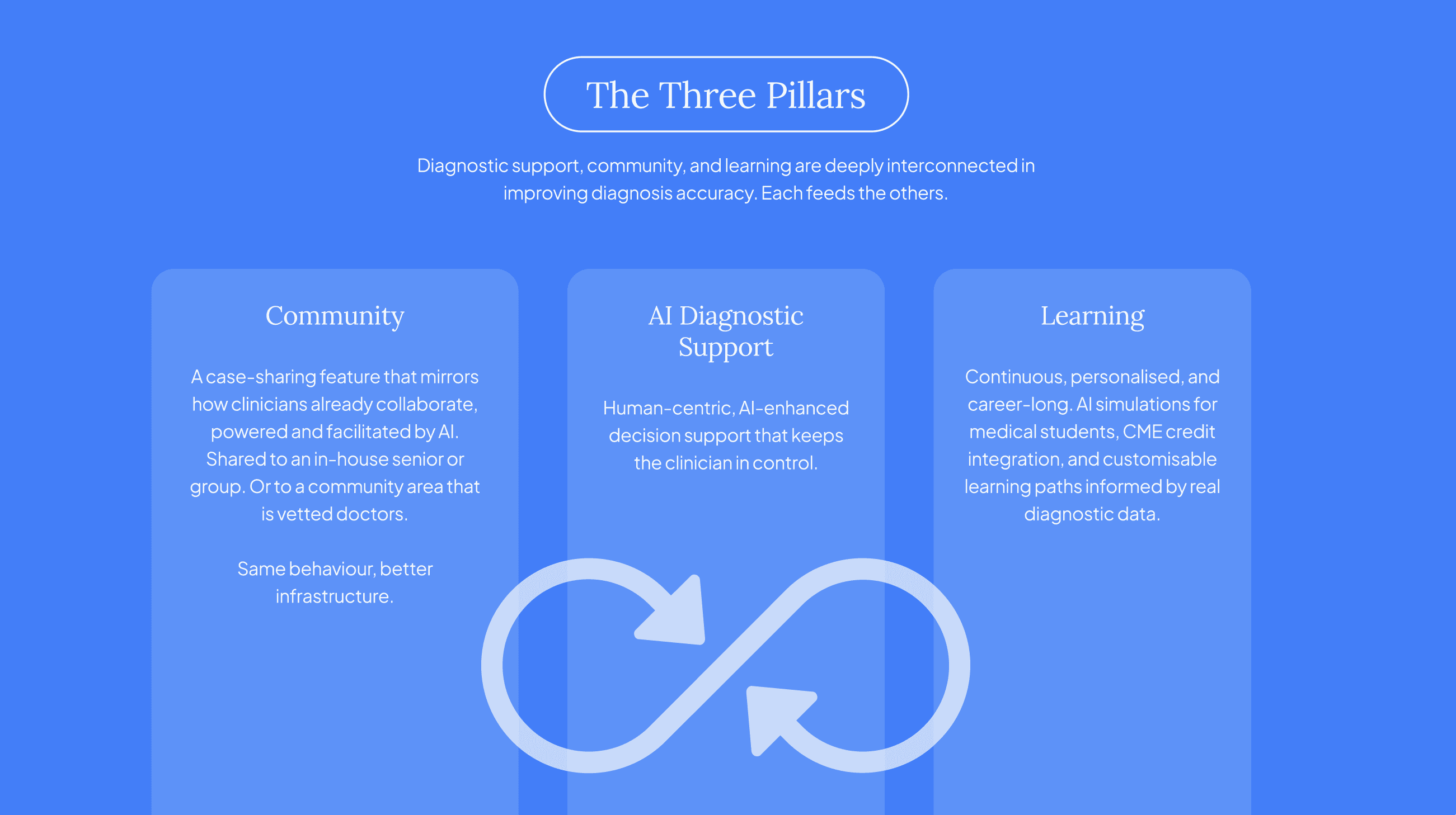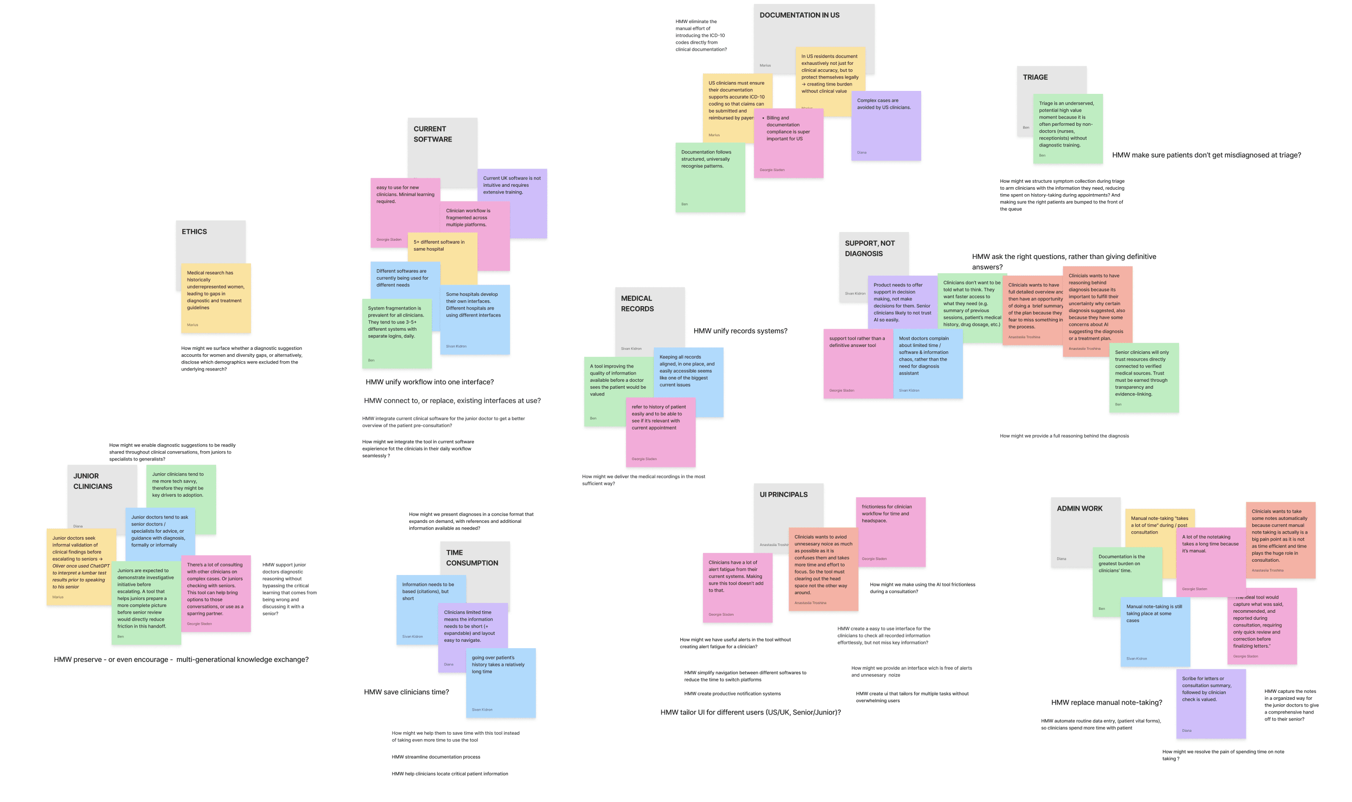 These insights crystallised our design challenge and problem statement: How can we design an AI clinical support tool that improves diagnostic accuracy and supports professional learning, while preserving the human element of decision-making? And how might it integrate frictionlessly into the systems and rhythms of everyday clinical practice?