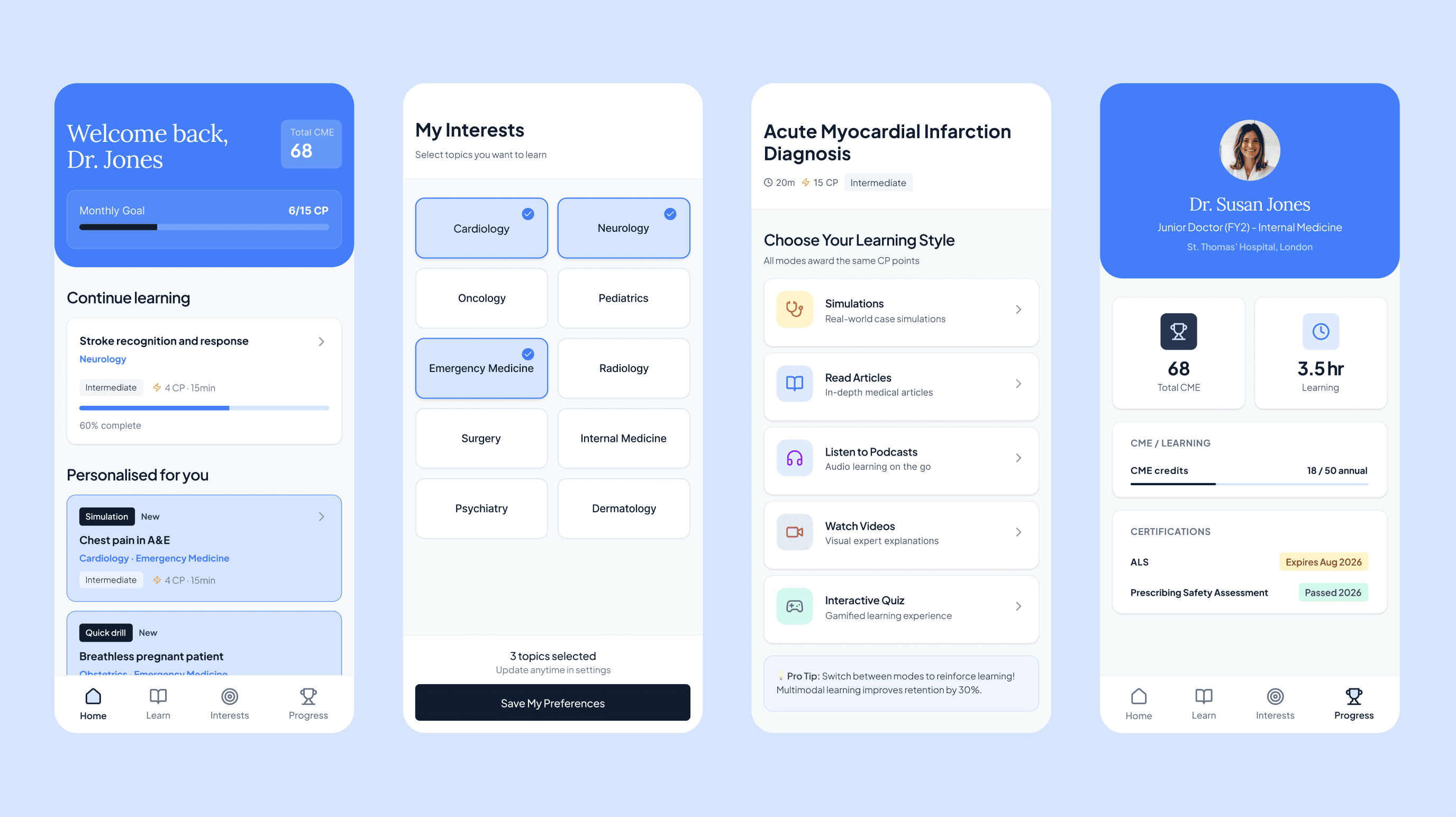 The second was an early concept for a mobile-first learning tool, designed to work in tandem with the diagnostic findings and support ongoing professional development. Both prototypes were presented to the Centyent team alongside our research and rationale. The next step is for their in-house product team to develop the concepts further and conduct user testing with clinicians — validating our findings and continuing to shape the product with real-world insight.